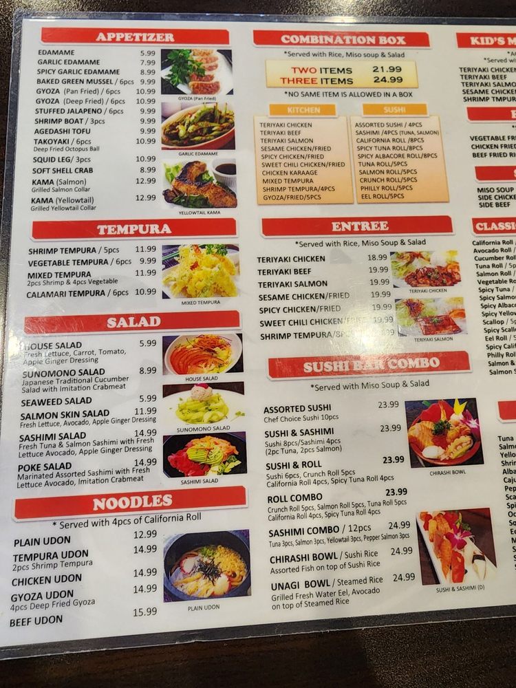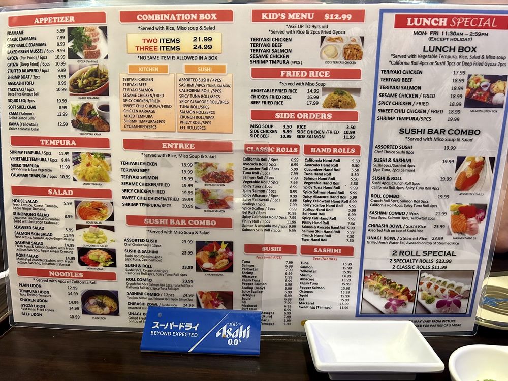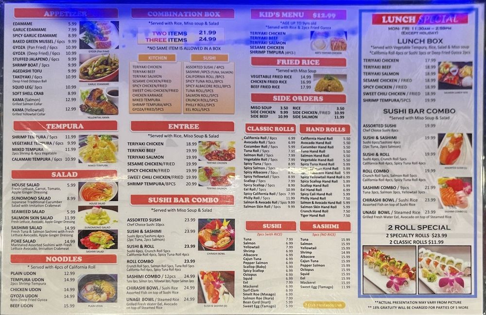Choose any options - assorted sushi, California roll, crunch roll, gyoza, tempura, Philly/salmon/spicy tuna/tuna roll, sashimi, sesame/spicy/sweet chili chicken, teriyaki beef/chicken/salmon.