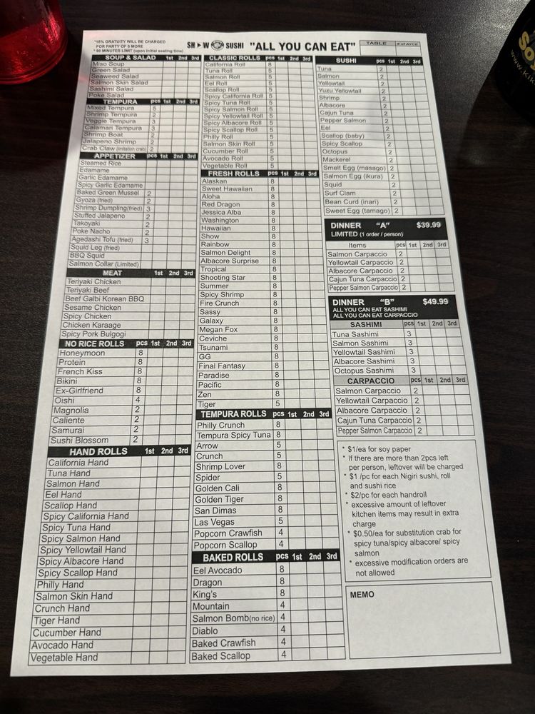 Show Sushi Menu (Update 2025)