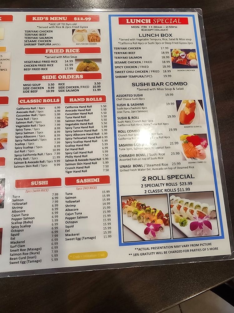Sushi six pieces, crunch roll five pieces, California roll four pieces, spicy tuna four pieces.